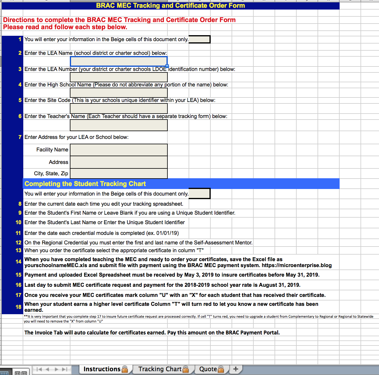 Student progress is tracked on the BRAC Micro-Enterprise Tracking Excel Form. You can download the form on the website http://www.microenterprise.blog/tracking. The Excel file has three (3) tabs to track students progress. The first tab is the “Instruction” tab and you will enter your school and teacher information into the beige cells of the first tab. This data will auto populate on the remaining two (2) tabs.